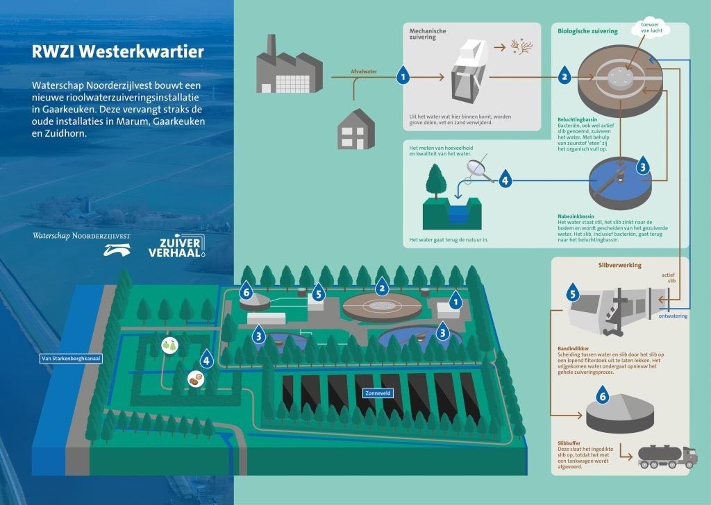 De nieuwe zuivering bestaat uit een ontvangstwerk (1) (mechanische zuivering) en de rotoflow (2) (biologische beluchting). Vervolgens stroomt het medium naar de beide nabezinktanks (3). Het schone water (effluent) stroomt via de overloop naar het Van Starkenborghkanaal (4). Het bezonken slib wordt via de retourslibpompen naar de rotoflow gepomp. Vanuit de rotoflow wordt slib gepompt naar een bandindikker (5). Het ingedikt slib wordt vervolgens naar de slibbuffertank (6) gepompt en daarna verder verwerkt op de RWZI Garmerwolde.
